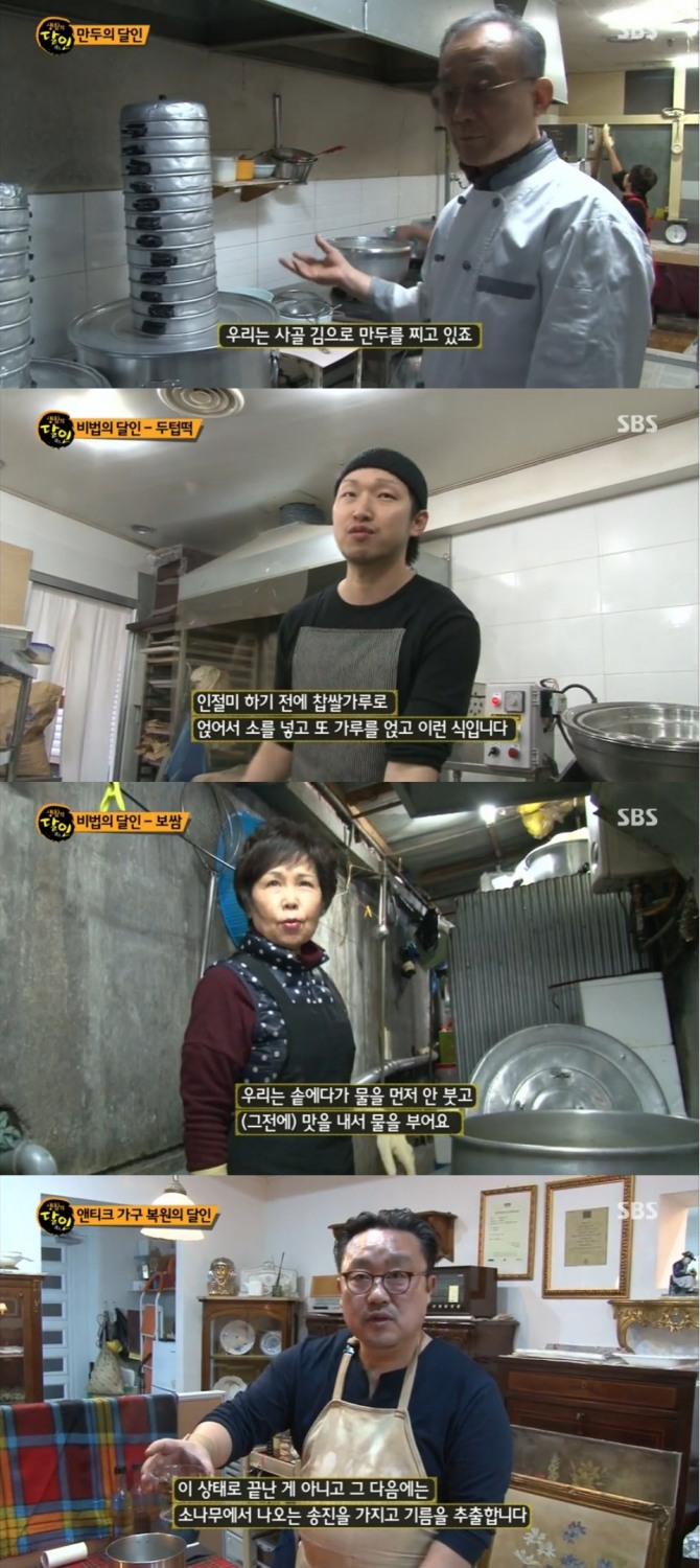 이미지 확대보기지난 5일 밤 방송된 SBS '생활의 달인' 613회에서는 33년 내공의 노희탁(65) 만두 달인, 궁중떡으로 3대째 이어가는 안상민 두텁떡 달인, 21년 경력 이현순(69) 보쌈 달인, 조정희(47) 엔티크 가구 복원 달인이 출연해 남다른 실력을 과시했다.