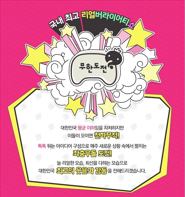 무한도전의 시작은 ‘무모한 도전’이다. 무한도전의 1기로 분류된다. 이 프로그램은 ‘초일류 연예인이 되기 위한 무한 프로젝트’를 지향했다. MBC에서 큰 기대 없이 만든 프로그램이기 때문에 최저가 예산으로 시작했다. HD 방송 역시 제공되지 않았다.