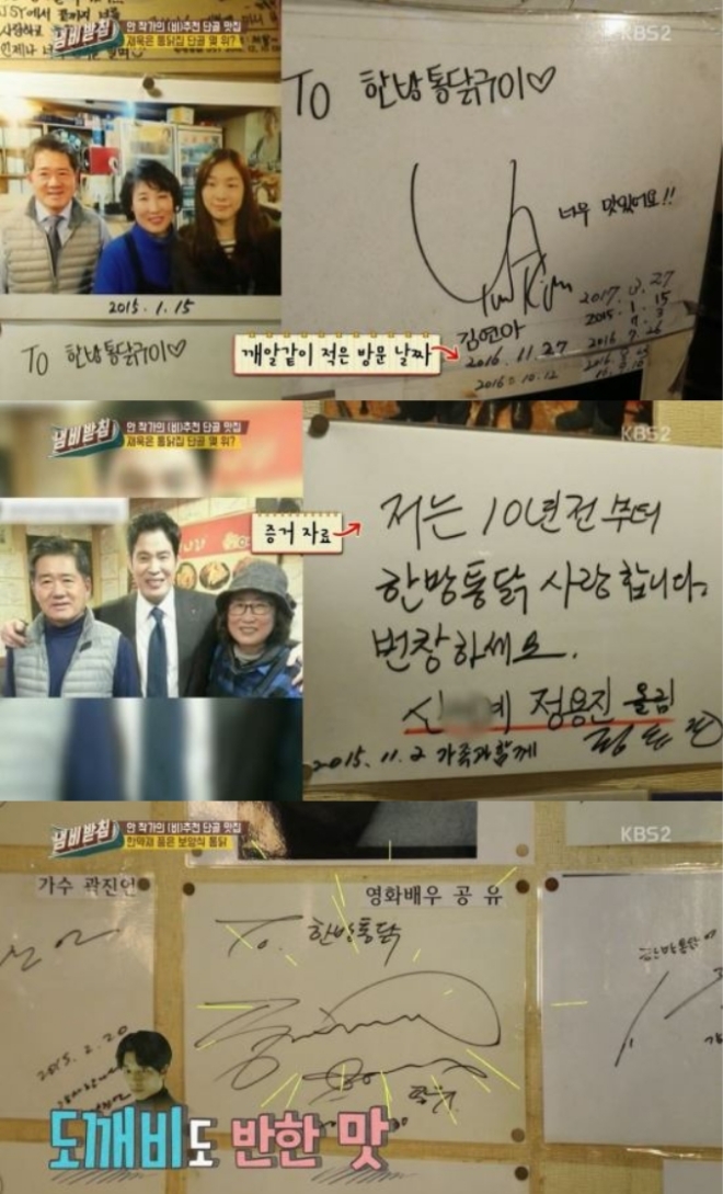 싸인 뿐 아니라 치킨집 사장과 함께 사진을 찍어 '단골'임을 증명했다.