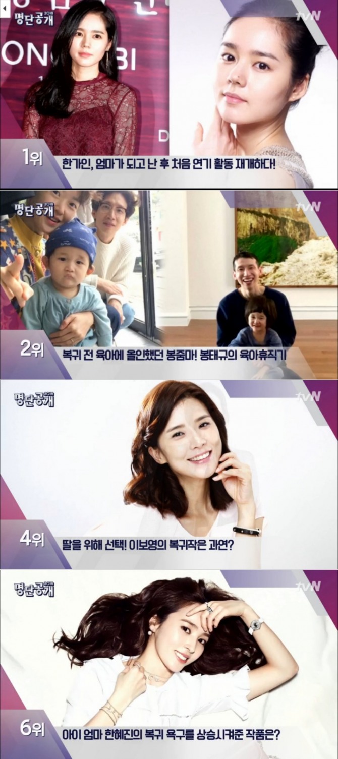 이미지 확대보기19일 밤 방송된 tvN '명단공개 2018'(이하 명단공개)에서는 '성공 복귀 워킹 맘&대디 스타' 순위가 발표된 가운데 한가인, 봉태규, 지성-이보영 부부, 김남주, 핞케진, 전혜진 등이 이름을 올렸다.