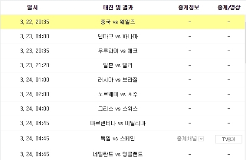 경기일정은 3월 22일 중국과 웨일즈와의 경기부터 3월 23일 우루과이 체코가 같은 시각에 개최된다.