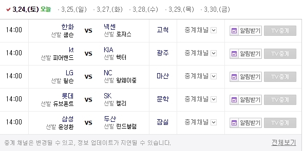 이미지 확대보기24일 오후 2시에 한화 이글스와 넥센 히어로즈(고척돔), kt 위즈와 기아 타이거즈(광주), lg 트윈스와 nc 다이노스(마산), 롯데 자이언츠와 sk 와이번스(문학), 삼성 라이온즈와 두산 베어스(잠실경지장)와 경기가 열린다.