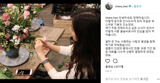 꽃꽂이를 하고 있는 자신의 사진과 함께 글을 올린 한채아는 "행복한 날들을 보내던 제게 새 생명이라는 또 다른 선물이 찾아왔다"며 "저는 현재 6주차에 접어든 예비엄마가 되었다"고 밝혔다.