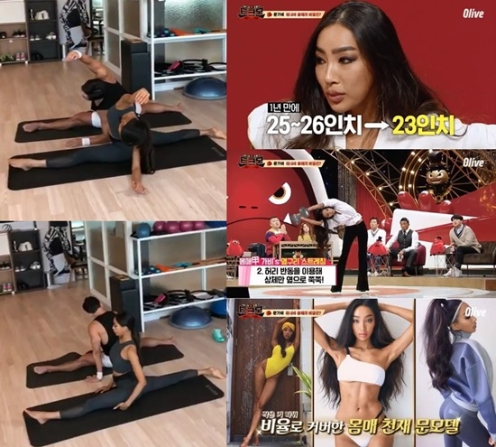 무엇보다 '개미허리' 소유자로 유명한 문가비는 잘록한 허리를 위한 옆구리운동법을 직접 시연해 눈길을 끌었다. 덤벨을 들고 매일 옆구리운동을 한다는 그는 "스트레칭을 하루에 100번씩 한다"며 "면서 "1년 만에 허리가 25인치에서 23인치가 됐다"고 밝혔다.