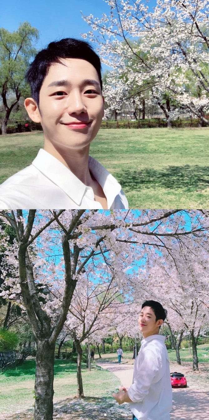 사진 속 정해인은 흰 티셔츠를 입고 활짝 핀 벚꽃을 바라보며 미소를 짓고 있어 설렘을 선사했다.