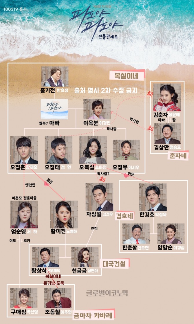 120부 작으로 중반부에 접에 들고 있는 tv소설 '파도야 파도야' 인물관계도는 다음과 같다.