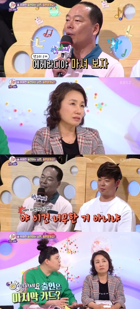 어렵게 방송 출연을 결심한 아내는 "정말 마지막이라고 생각하고 '안녕하세요'에 나왔다"면서 남편이 술을 끊었으면 좋겠다는 바람을 전했다. 남편은 "그게 무슨 고민거리야? 하면서 나왔는데 청문회하는 느낌이 든다"고 머쓱해 하면서도 "100표가 넘으면 술 끊는데 도전을 해보겠다"고 말했다.