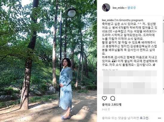 이미도는 11일 자신의 인스타그램에 "축하받고 싶은 소식 있어요. 저 임신했어요"라며 사진과 글을 게재했다.