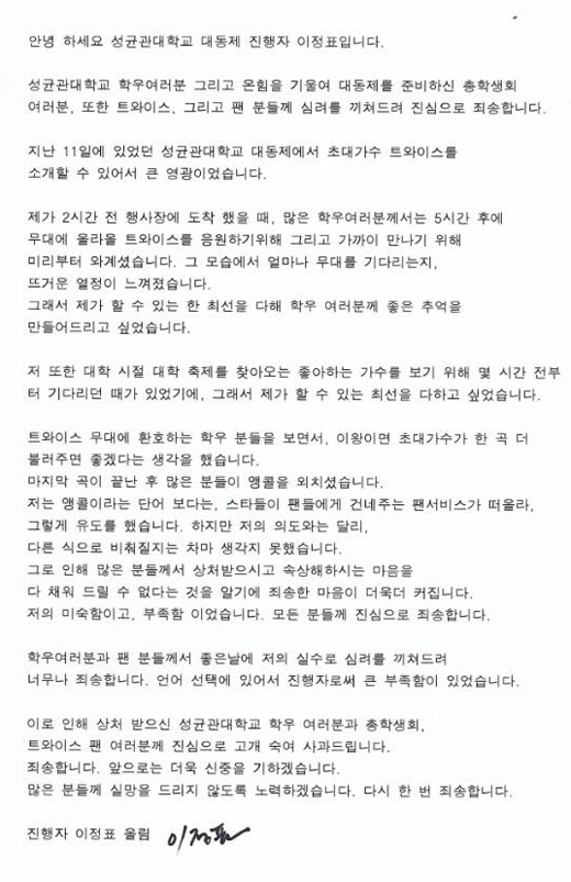 이정표는 14일 이정표는 성균관대학교 총학생회를 통해 "상처 받으신 성균관대학교 학우 여러분과 총학생회, 트와이스 팬 여러분께 진심으로 고개 숙여 사과드린다"며 "죄송하다. 앞으로는 더욱 신중을 기하겠다"고 사과했다.
