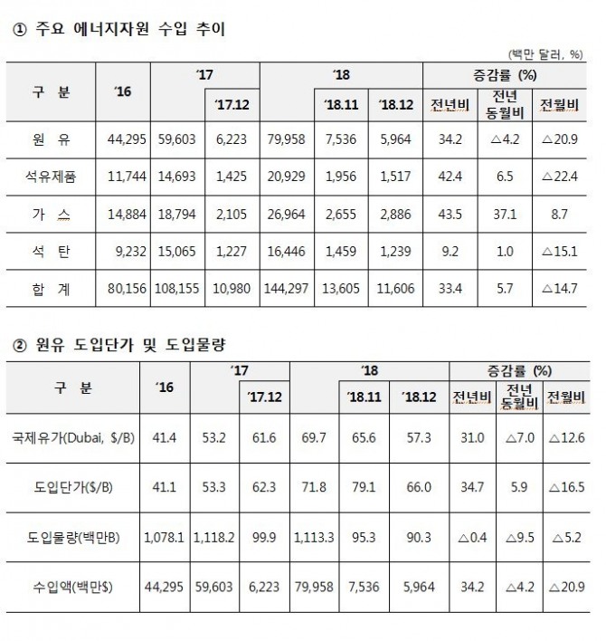 원유와 석유제품, 가스, 석탄 등 4가지 에너지자원의 수입규모는 지난해 총 1,442억 9,700만달러로 2017년에 비해 33.4% 증가했다. 4대 에너지원 수입은 전체 수입(5349억 9,000만달러)의 약 27%를 차지했다.석유제품 수입액은 209억 2,900만 달러로 전년 대비 42.4% 증가했고 가스 수입은 269억 6,400만 달러로 전년에 비해 43.5%나 불어났다. 석탄 수입은 9.2% 증가한 164억 4,600만 달러를 기록했다.