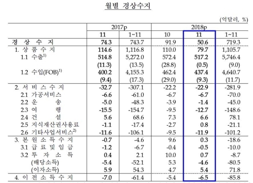 8일 한국은행이 '2018년 11월 국제수지(잠정)'에 따르면, 지난해 11월 경상수지 흑자 규모는 50억6000만 달러로 집계됐다.