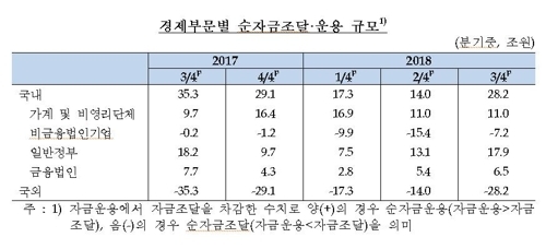 9일 한국은행이 발표한 '2018년 3분기 자금순환(잠정)'에 따르면 가계·비영리단체의 순자금운용 규모는 11조 원으로 지난해 2분기와 같은 수준을 나타냈다.