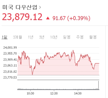 미국 다우지수는 9일(현지시간) 전날 대비 91.67포인트(0.39%) 오른 2만 3879.12에 장을 마쳤다.