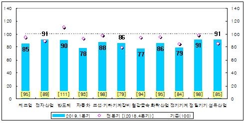반도체(90)를 비롯한 자동차(78)와 조선·기타운송(88) 등 운송장비업과 철강금속(77) 등은 크게 부진하고, 전자(91)와 섬유(91)만 전 분기보다 약간 좋아질 것으로 나타났다.