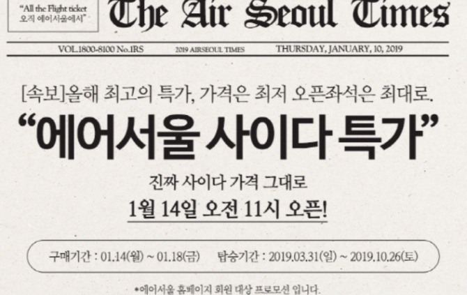 [글로벌이코노믹 온기동 기자] 에어서울이 14일 오전 11시부터 18일까지 ‘사이다 특가’ 이벤트를 시작하면서 포털을 달구고 있다.