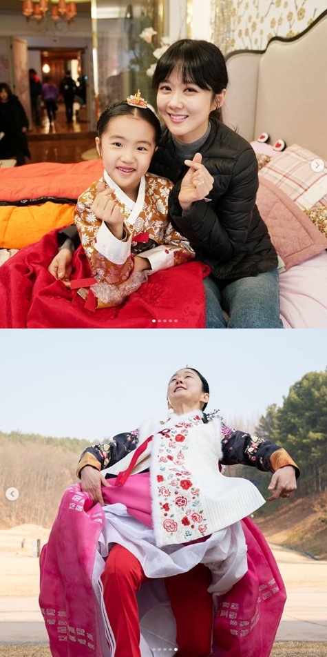 사진 속 장나라는 한복을 입은 오아린과 손하트를 만드는 가 하면 제기차기 신공을 선보여 웃음을 선사했다. 특히 장나라는 오아린과 비슷한 정말 작은 얼굴 크기로 시선을 사로잡았다.