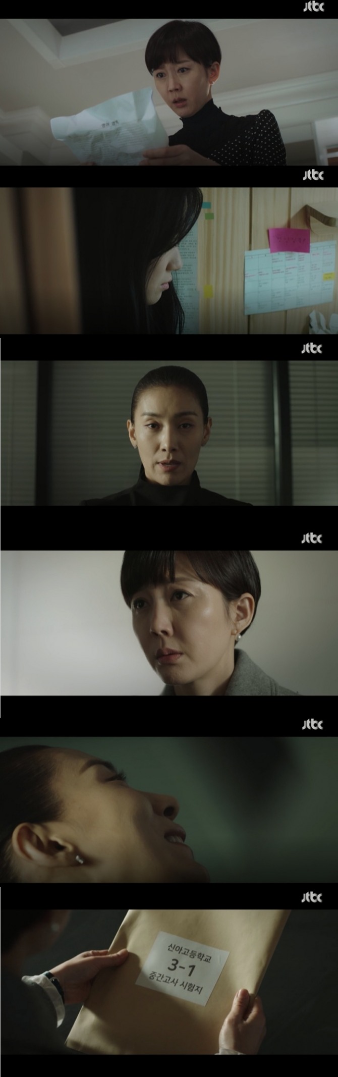이미지 확대보기19일 방송된 JTBC 금토드라마 '스카이(SKY)캐슬'(극본 유현미 연출 조현탁) 18회에서는 모의고사 성적이 하락한 예서(김혜윤 분) 때문에 입시코디 김주영(김서형 분)을 다시 찾은 서진(염정아 분)이 학교에서 빼돌린 3학년 1학기 중간고사 시험지를 보고 또 다시 흔들리는 반전이 그려졌다.