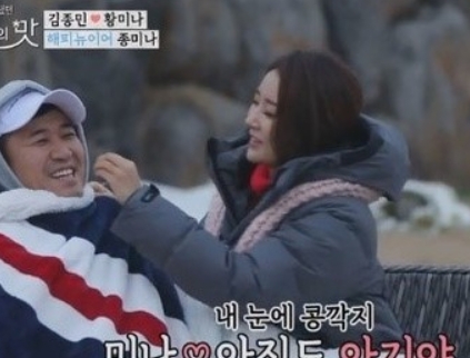 연애의 맛은 연예인과 일반인과의 100일 계약커플로 진행되는 프로그램이다. 김종민의 나이는 올해 40살, 황미나는 26살이다.