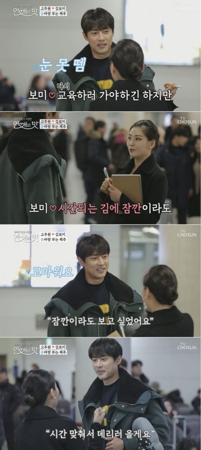 이미지 확대보기14일 밤 방송된 TV CHOSUN' 연애의 맛' 22회에서는 '봄바람 부는 제주'라는 부제로 고주원과 김보미의 데이트가 그려진 가운데 그동안 궁금증을 자아냈던 김보미의 직업이 항공사 지상직 승무원임이 드러났다.