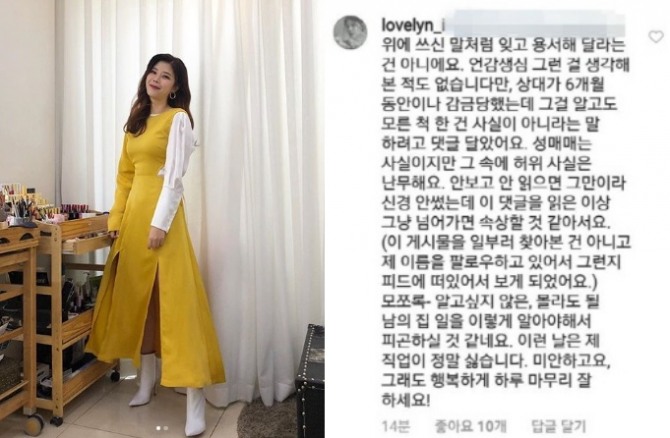 이어 린은 "성매매는 사실이지만 그 속에 허위 사실은 난무하다"며 "안 보고 안 읽으면 그만이라 신경 안 썼는데 이 댓글을 읽은 이상 그냥 넘어가면 속상할 것 같았다"며 댓글을 달게 된 이유를 밝혔다.