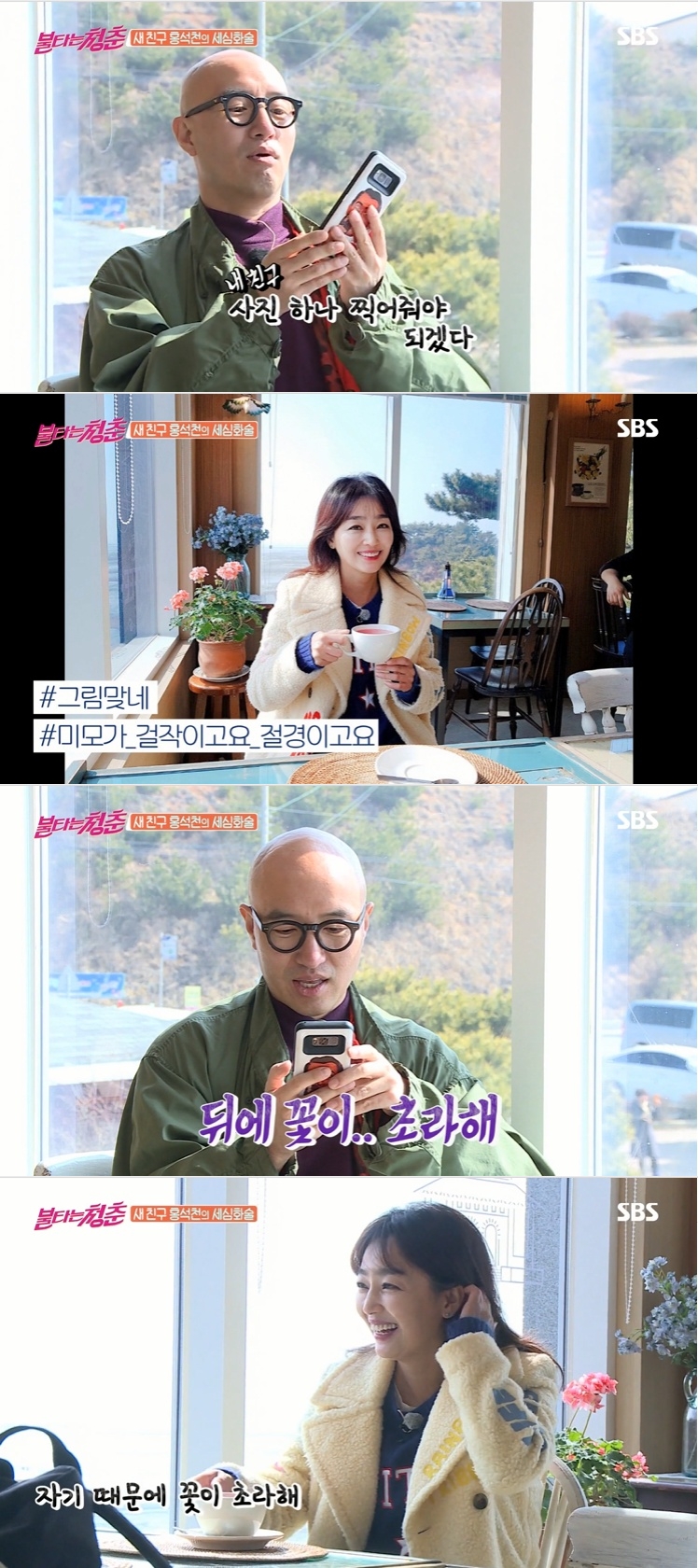 카페로 자리를 옮긴 홍석천은 "그림이네"라며 바다를 배경으로 이연수 사진을 찍어준 뒤 "뒤에 꽃이 초라해"라는 달달한 멘트를 날려 설렘을 선사했다. 뒤를 돌아본 이연수는 수줍게 웃으며 "고맙다. 친구야"라고 답했다.