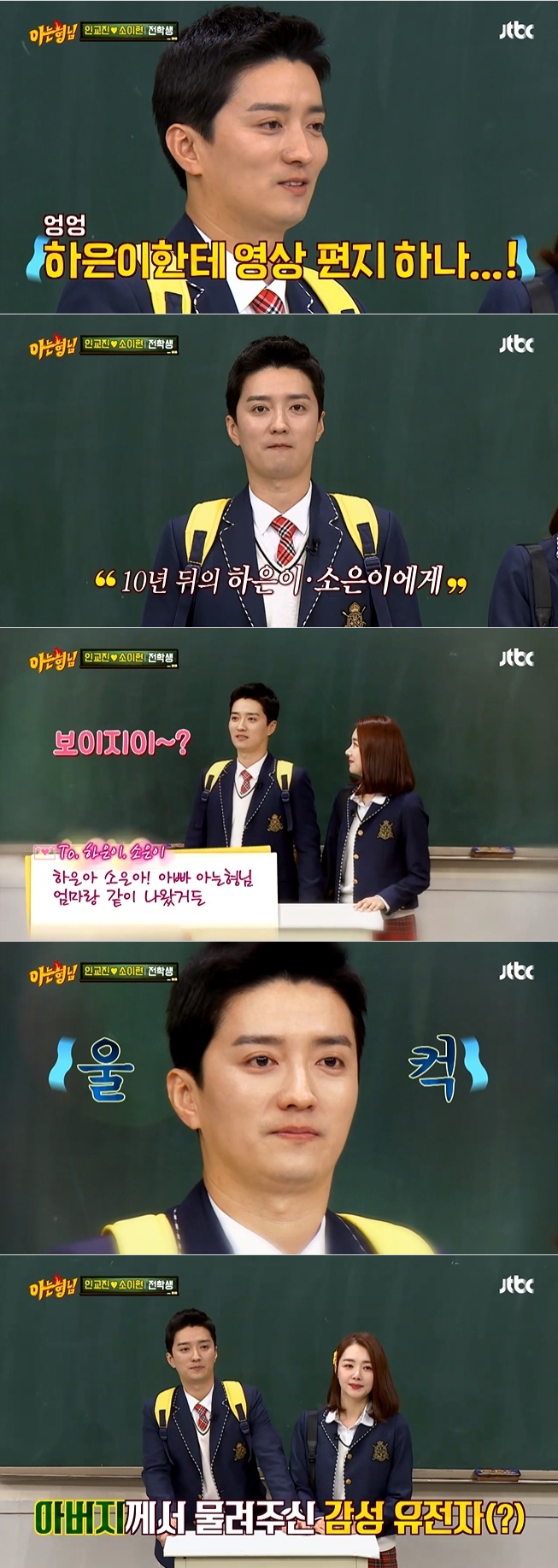 10년 뒤 하은이 소은이에게 영상 편지를 보내라고 하자 인교진은 "나 정말 울 것 같다"며 감성 풍부한 면모를 보였다.