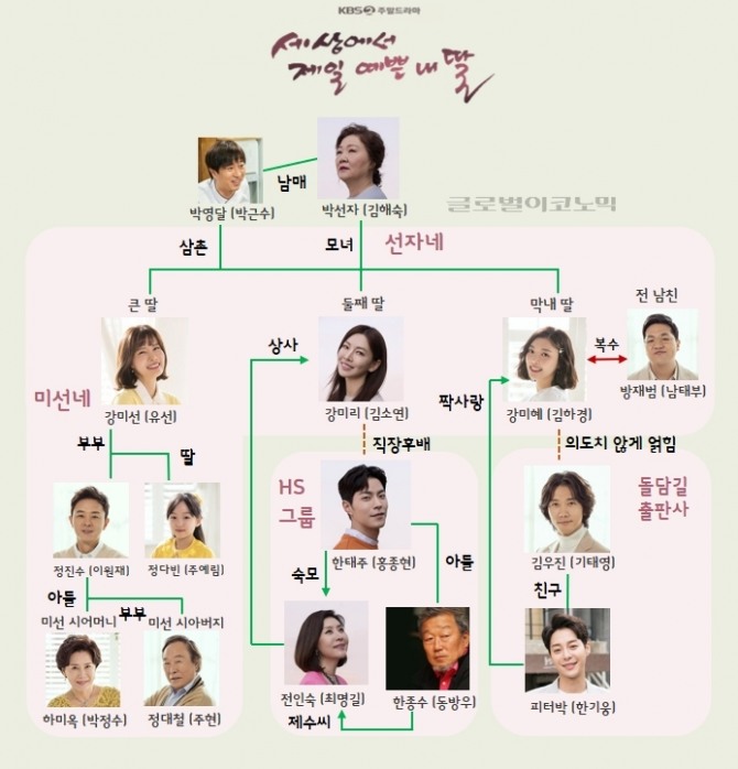김해숙, 유선, 김소연, 김하경, 최명길, 홍종현 등이 출연하는 '세상에서 제일 예쁜 내 딸' 인물관계도는 다음과 같다.