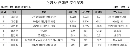 이에 따라 작년 말 연예인 주식부호 1위였던 이수만 SM엔터테인먼트 회장의 보유주식 가치는 1818억 원으로 488억 원, 21.1%나 줄었다.