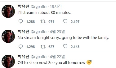 이미지 확대보기박유환은 24일 오후 5시 30분 경 자신의 트위터에 "I'll stream in about 30 minutes.(30분 후에 방송을 시작하겠다)"라는 글로 방송 재개 소식을 전했다.