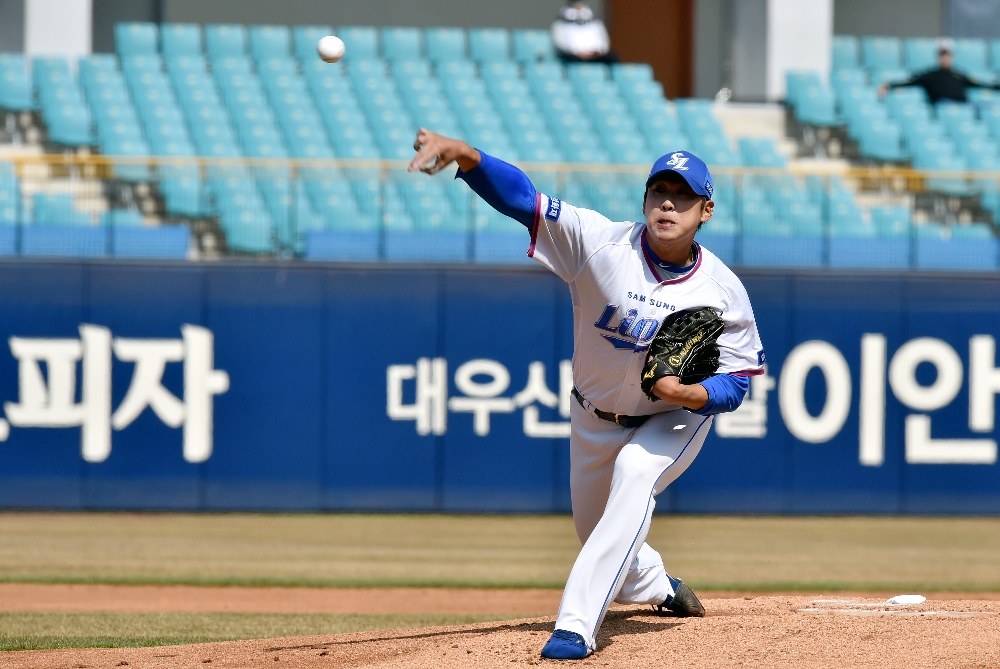 이미지 확대보기윤성환은 8일 대구 삼성라이온즈파크에서 열린 2019 신한은행 마이카 KBO리그 홈경기에 선발 등판해 9이닝 동안 99개의 공으로 NC 타선을 무득점으로 묶었다.