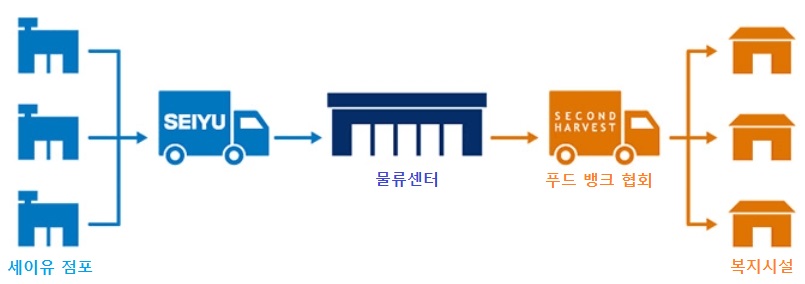 - 정기적으로 매장에서 수거 된 식품은 세이유 물류 센터로 이송 후, 푸드 뱅크 협회에 전달됨.