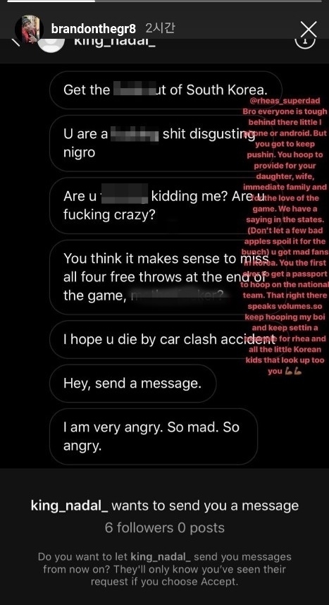 이미지 확대보기이 메시지에는 인종차별적 혐오 발언과 욕설이 가득했다. “한국에서 꺼져”라고 하는가 하면 “경기 막판에 자유투를 4개나 놓치는 게 말이 돼”라고 경기력을 비난하는 내용도 있다. 심지어 “네가 교통사고를 당해 죽었으며 좋겠어”같은 저주스런 문구도 있다.