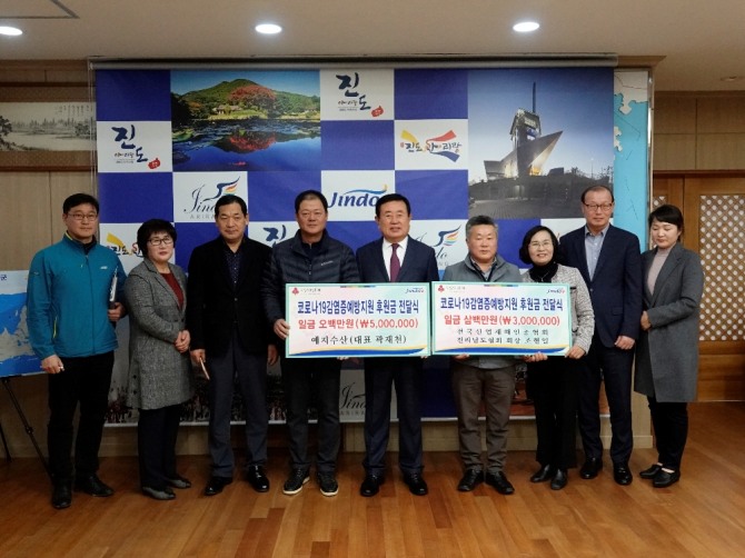진도군은 후원금을 사회복지공동모금회와 연계해 손세정제와 마스크를 구매해 방역일선에 지원할 계획이다.