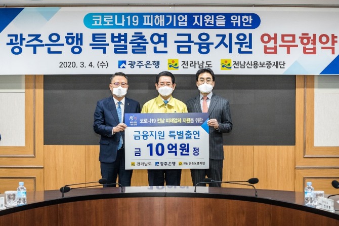 이미지 확대보기‘코로나19’의 확산으로 불황의 직격탄을 맞은 소기업·소상공인의 대출과 보증지원 신청이 대폭 증가하는 가운데 광주은행은 지역의 어려움을 함께 이겨내고자 전남신용보증재단에 10억원을 특별출연하고, 전남신용보증재단은 이를 재원으로 총 120억원의 특별보증을 지원하기로 했다.
