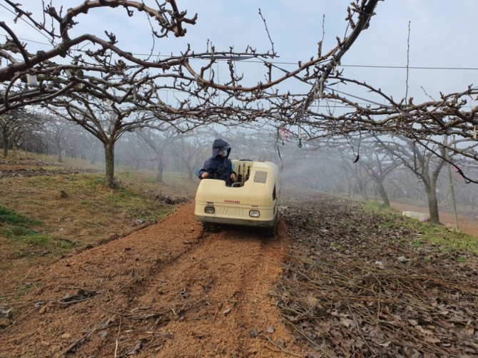 월동병해충의 활동 또한 빨라짐에 따라 기계유유제 살포적기는 발아 7일 전 2월 하순 ~ 3월 상순으로 병해충 발생생태와 수체생육 진행상황에 따라 살포하며, 석회유황합제는 기계유유제 살포일로부터 최소 2주 후 살포해야 약해가 없다.