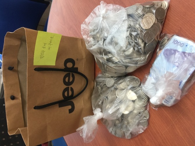 동장과 직원들이 내용물을 확인한 결과, 종이가방 안에는 천원권 12매와 네 종류의 동전 1,439개를 합한 242,620원이 들어있었다.