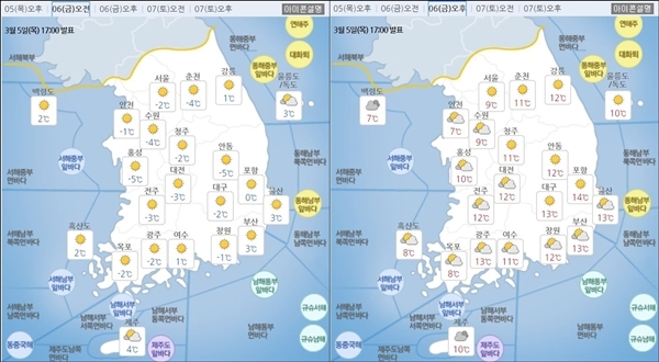 아침 최저 기온은 영하 7도~영하 3도로 평년보다 3도 이상 떨어지겠다. 지역별로 ▲서울 -2도 ▲춘천 -4도 ▲강릉 1도 ▲인천 -1도 ▲수원 -4도 ▲청주 -2도 ▲대전 -3도 ▲전주 -3도 ▲대구 -2도 ▲부산 3도 ▲울산 3도 ▲광주 -2도 ▲목포 -2도 ▲제주 4도 ▲울릉도·독도 3도 등이다.