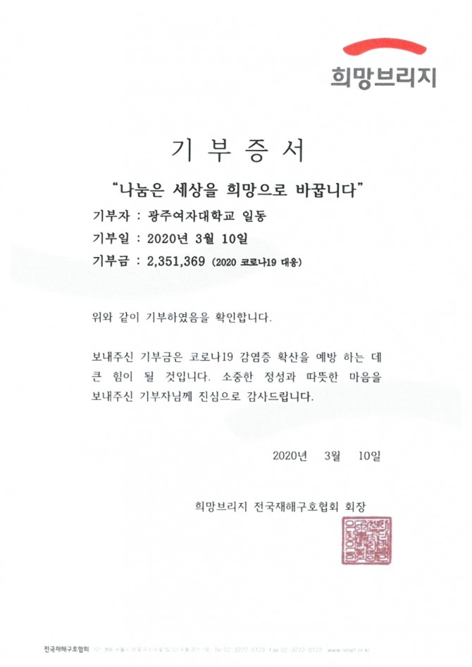 늘품 총학생회는 지난달 28일 1차 목표 200만원을 모금한 결과, 10일 만에 목표를 달성해 총 모금금액인 235만 1,369원을 '광주여자대학교 일동' 명의로 희망브리지 전국재해구호협회에 기부했다.