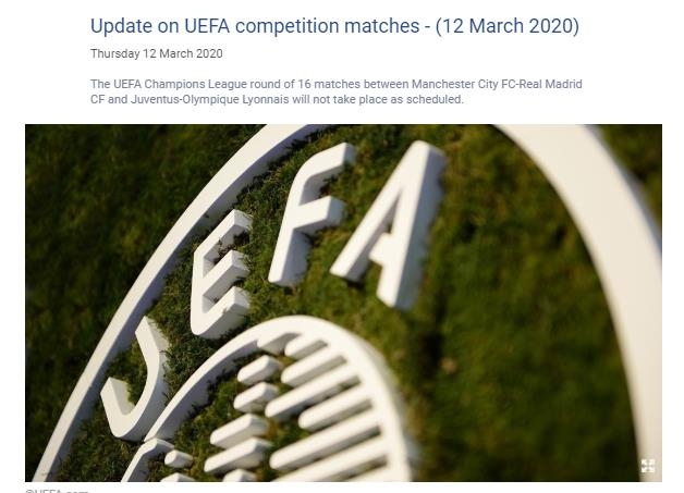 이미지 확대보기UEFA는 18일(한국시간) 예정된 맨체스터 시티(잉글랜드)-레알 마드리드(스페인), 유벤투스(이탈리아)-리옹(프랑스)의 2019-2020 UCL 16강 2차전을 예정한 날짜에 치를 수 없게 됐다고 13일 밝혔다.