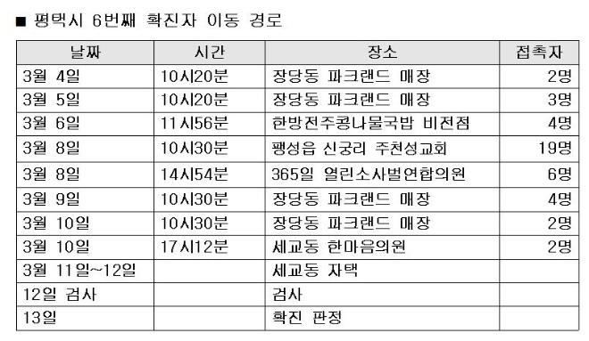 평택시가 지난 13일에 확진 판정을 받은 6번째 확진자의 이동경로를 발표했다.
