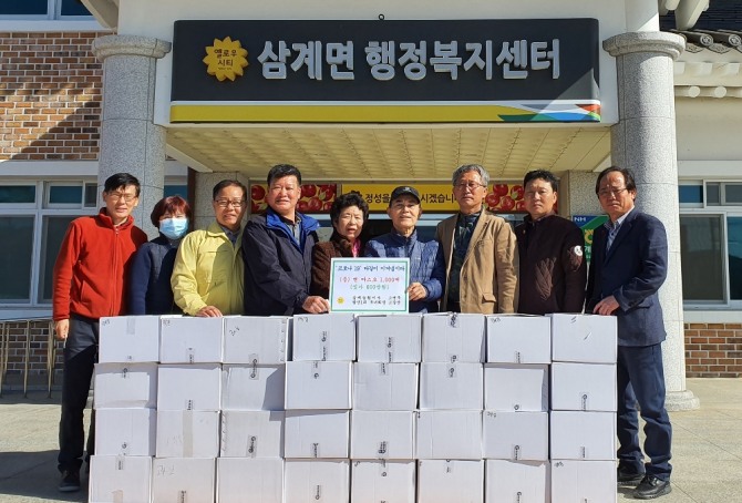 이미지 확대보기지난 11일 삼계면 주민인 고면주, 고갑순 남매가 코로나19 예방을 위한 마스크 1000매(600만원 상당)를 삼계면 이장협의회에 기부했다.