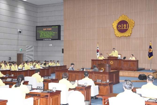 이미지 확대보기이번 임시회에서는 2019회계연도 결산검사위원을 선임하고, 조례안 34건, 규정안 2건, 동의안 6건, 보고안 4건, 건의안 1건 등 총 47건의 안건을 처리했다.