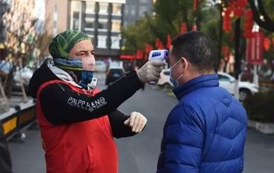 외국인 자원봉사자가 중국 시민의 체온 측정 중