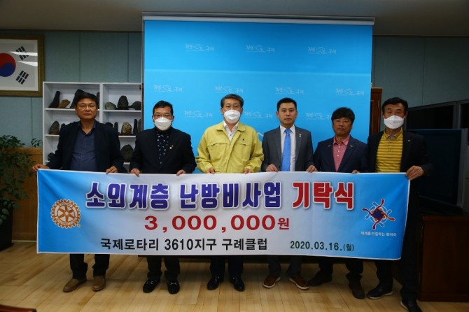 이미지 확대보기국제로타리클럽 3610지구 구례클럽(회장 김준순)은 16일 구례군청을 방문해 코로나19 확산 방지를 위해 써달라며 성금 300만 원을 기탁했다.