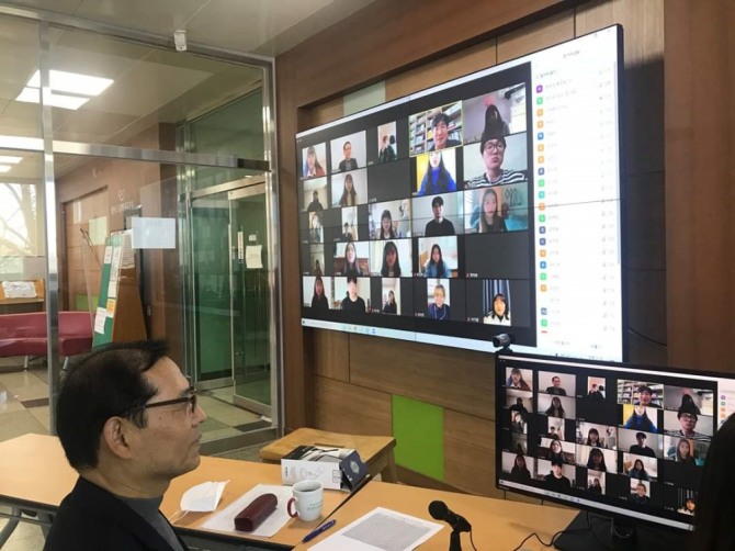 간담회는 이날 오후 2시에 13개 학과별로 동시에 실시됐으며, 지도교수와 학과 소개, 재택수업 운영 등 학사일정 안내, 학우들 간의 인사 등으로 진행됐다.