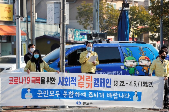 신우철 완도군수는 “다음달 5일까지는 코로나19를 잡을 수 있는 골든타임이다”며 “고강도 사회적 거리두기는 우리의 일상, 안전한 대한민국을 되찾기 위한 대책인 만큼 우리 군민들이 성숙된 의식을 갖고 적극 동참해줄 것을 부탁드리고, 군에서도 온 행정력을 동원해 코로나19 예방 및 확산 방지에 총력을 기울이겠다”고 말했다.