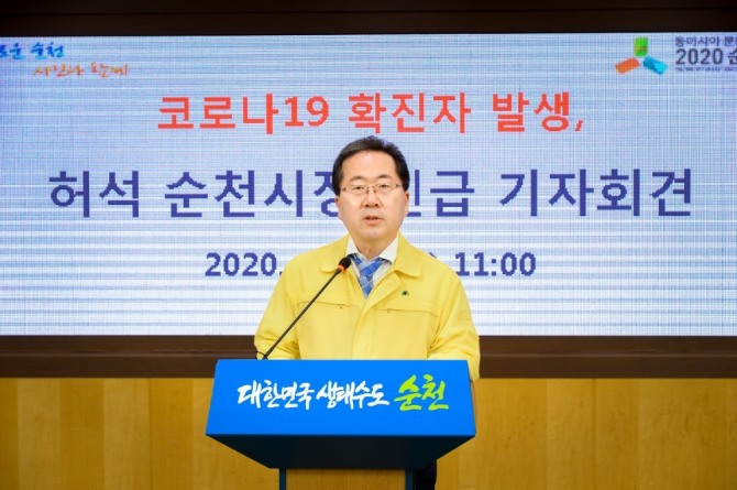 이미지 확대보기허석 순천시장은 긴급 기자회견을 통해 영국에서 파견 근무중 귀국한 43세 남성 A씨가 전남환경보건연구원의 검사에서 확진으로 통보받았다고 전했다.