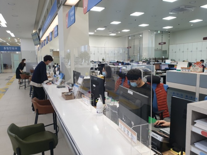 설치된 가림막은 투명 아크릴로 제작해 직접적인 접촉을 최소화하면서도 답답함 없이 민원상담과 업무처리가 가능하며, 창구 직원과 민원인 모두 감염병으로부터 안전한 거리를 유지할 수 있을 것으로 기대된다.