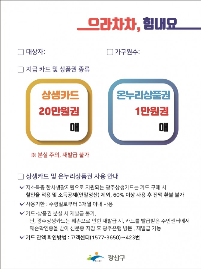 이미지 확대보기지역상품권을 지원하는 형태로 전국에서 진행되는 이번 사업은, 광주광역시에서는 광주상생카드와 온누리상품권을 섞어 나눠준다. 본격적인 지원에 앞서 광산구는, 지원대상인 기초수급자와 차상위계층 12,409가구 선별을 마쳤다.