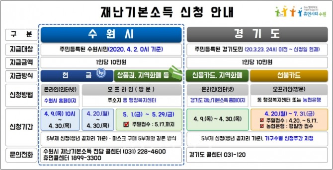 수원시민을 비롯한 모든 경기도민에게 1인당 10만 원을 ‘경기도 재난기본소득’은 4월 9일부터 7월 31일까지 신청할 수 있다. 3월 23일 자정 이전부터 신청일까지 경기도에 주민등록이 된 도민이 신청할 수 있다.